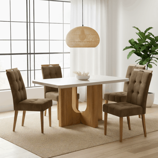 Mesa Dora 120 Cinamono/Off White com 4 Cadeiras Sophia Veludo Bege – VALDEMÓVEIS + WM DECOR